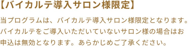 当プログラムは、バイカルテ導入サロン様限定となります。バイカルテをご導入いただいていないサロン様の場合はお申込は無効となります。あらかじめご了承ください。