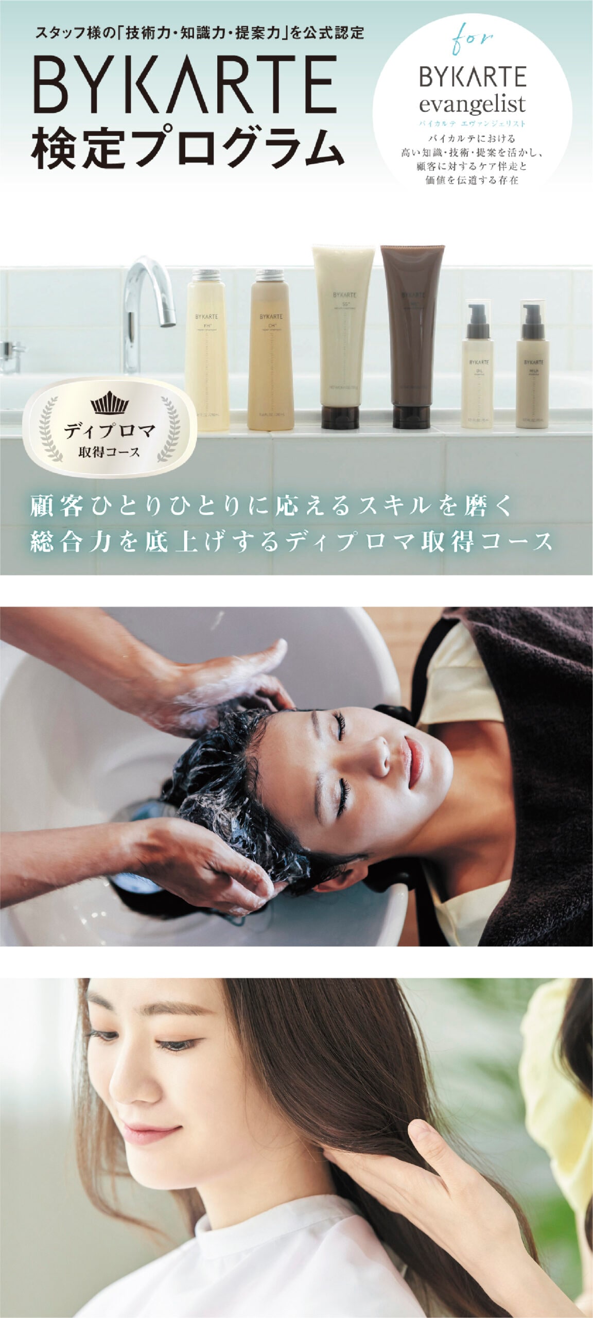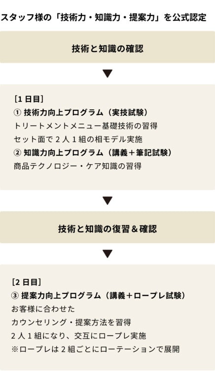 バイカルテのコンセプト「あなたに合わせた、顧客ひとりひとりのカルテ。」を実現するための総合スキルを身につけます。テキストでの予習準備と復習による反復学習で、知識の基礎定着を図り、2日間にわたる実技・筆記・ロープレ・講義のカリキュラムを通じて、プロとしてのケア伴走力を磨き上げます。全試験合格でディプロマを取得でき、ワンランク上の総合的なスキルアップを目指す理美容師の方に最適な検定プログラムです。